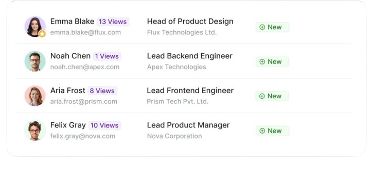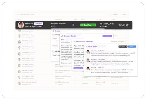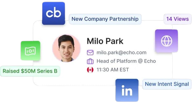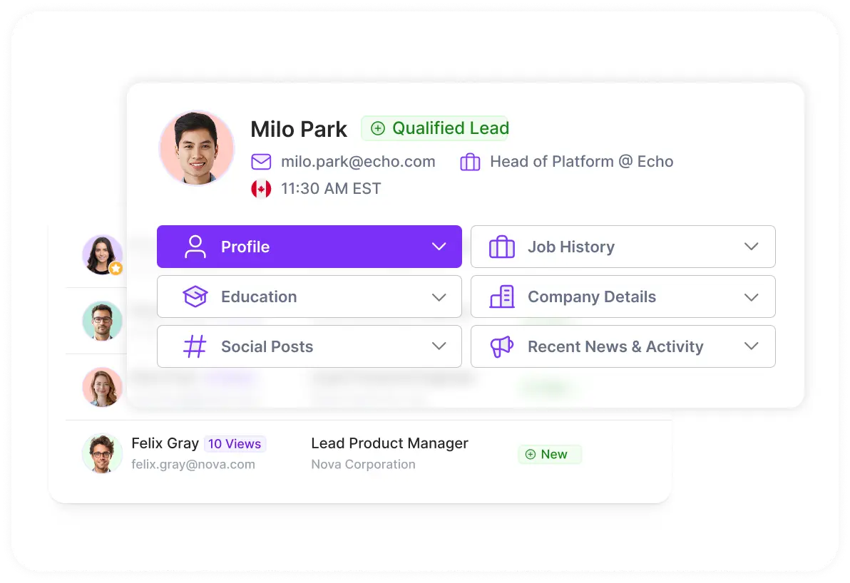 Unlock rich company insights and decision-maker contact details, aggregated from platforms like LinkedIn, X, Crunchbase, and more — all in one unified lead profile.
